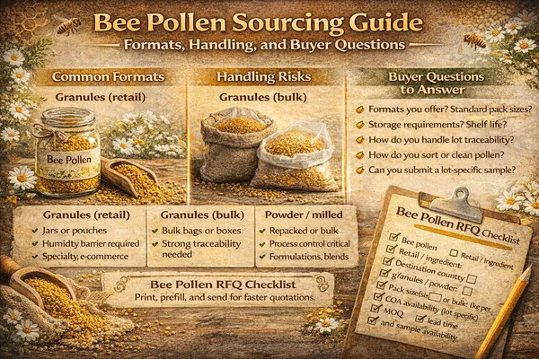 Bee pollen can be a strong category builder because it fits “daily routine” usage moments (breakfast, smoothies, yogurt). The main sourcing challenge is less about marketing and more about handling and consistency: moisture exposure, odor absorption, and variation in granule size can materially affect buyer acceptance.