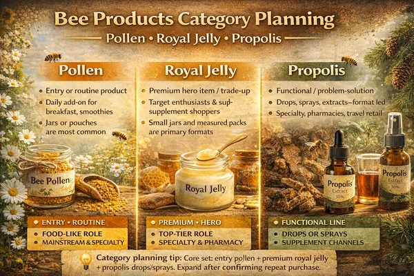 | Propolis | Functional-format line (problem/solution) | Drops/sprays/extracts; format-driven purchase with clear usage occasions | Specialty, pharmacies (where applicable), travel retail, e-commerce |